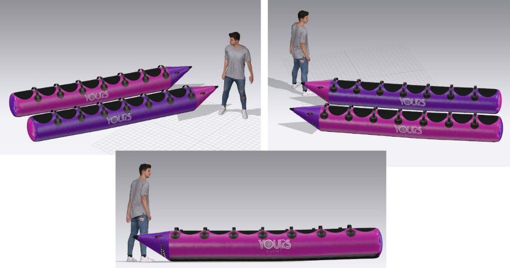 Веселый командный аттракцион, напоминающий гигантскую надувную "сосиску" или торпеду.Участники садятся верхом друг за другом и должны синхронно передвигаться, чтобы "торпеда" плыла к финишу. Требует идеальной слаженности действий и чувства ритма всей команды.