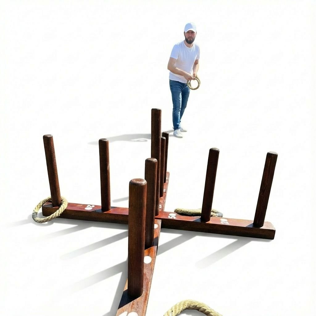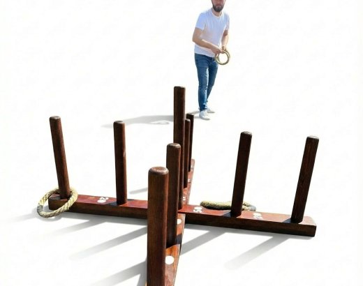 Кольцеброс был самой популярной детской забавой в 60-е и успешно перешел в разряд современных игровых станций для тимбилдинга. Эта простая, но увлекательная игра создана специально для тренировки меткости и ловкости. Цель игры заключается в том, чтобы набрать максимальное количество очков, набрасывая веревочные кольца на штыри.