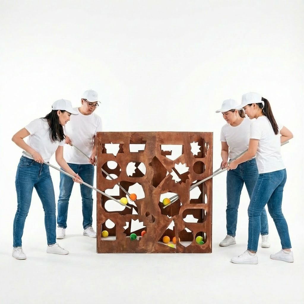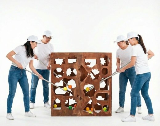 Задание на совместное преодоление сложностей!На дне клетки лежит мяч, задача команды с помощью узких палочек и отверстий в клетке вынуть его.Сделать это можно только совместными усилиями всей команды.