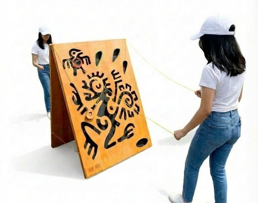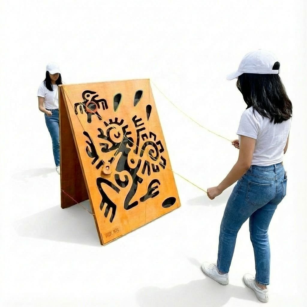 Игра на аккуратность и терпение. Поверхность деревянного поля представляет собой стену с небольшими отверстиями разного диаметра. Игроки держат нити, на которых подвешено кольцо с шариком внутри, и пробуют доставить маленький шарик в верхнее отверстие с самого низа. Сложность заключается в преодолении множества отверстий на пути шарика.