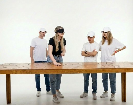 Слепой лабиринт — это командная игра на доверие и синхронность. Участник с завязанными глазами проходит маршрут, ориентируясь только на голосовые подсказки команды. Необходимо на время провести шайбу по маршруту от точки А до точки B.